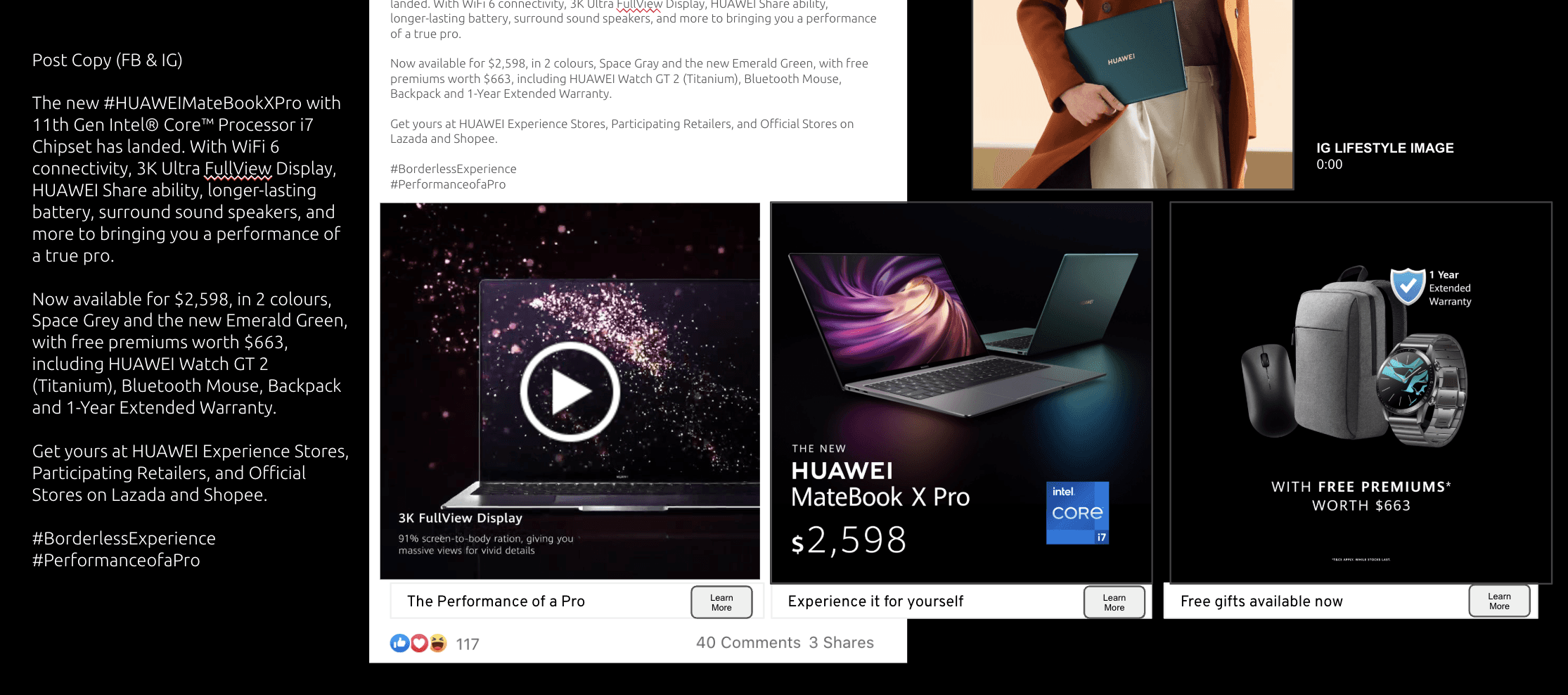 At a strategic level, I helped engineer the creative ecosystem for Huawei’s product launches—designing toolkits, style guides, and adaptable campaign frameworks that could be localized effectively across markets such as Singapore, Malaysia, Thailand, Vietnam, and the Philippines. These frameworks provided clarity and cohesion, empowering regional agencies and internal teams to deliver work that maintained visual and tonal consistency while reflecting local cultural nuances.